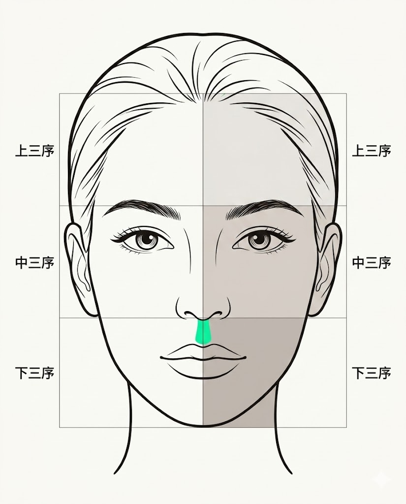 在東方面相學與西方美學中,都有一個共通的原則:面部的和諧來自比例的平衡。傳統的「三庭五眼」理論將面部縱向分為上庭(髮際線到眉毛)、中庭(眉毛到鼻尖)、下庭(鼻尖到下巴)三等分。